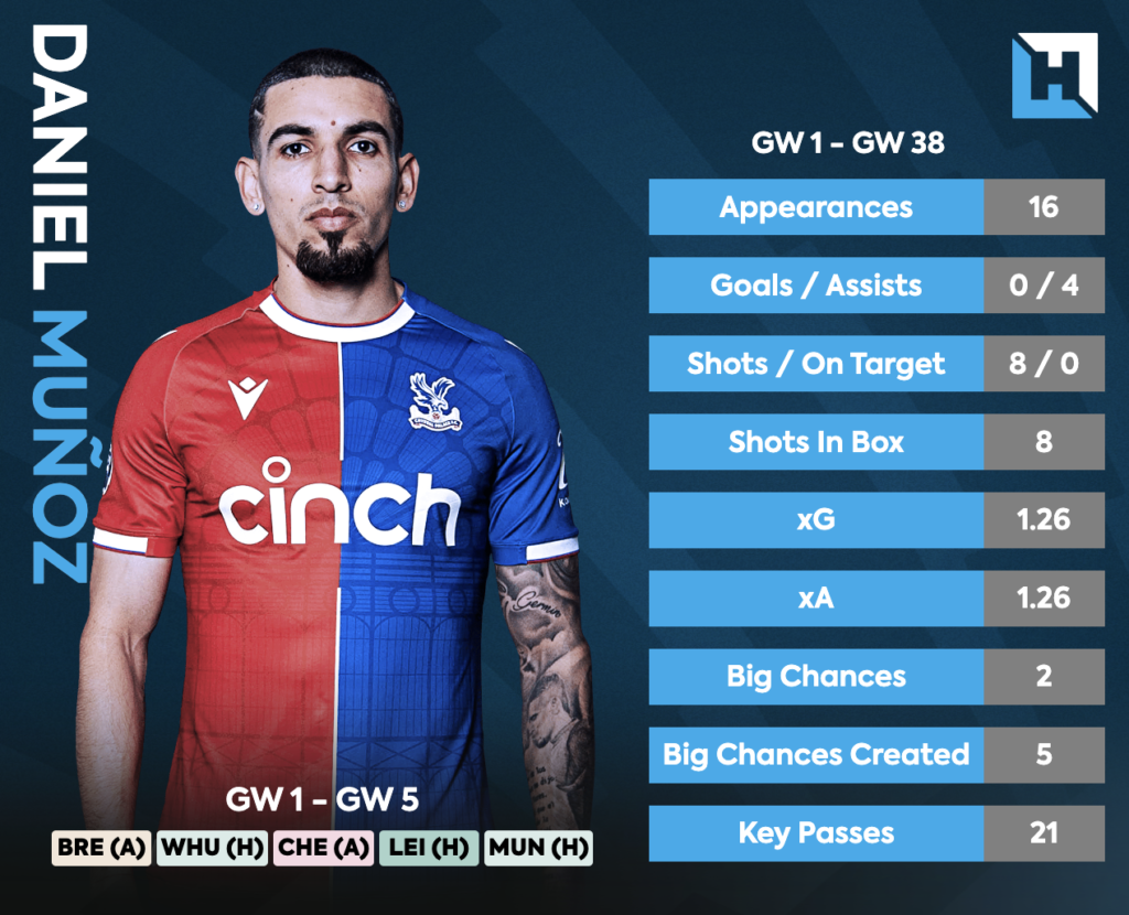 While many in the FPL community prefer Andersen (£4.5m) and Guehi (£4.5m) due to their price tag, Munoz, at only 0.5m more, could prove to be a bargain come the end of the season, especially if he carries his form from the end of last season into this one. The Colombian only joined The Eagles at the end of January, but made himself not only an essential part of new Manager Glasner’s plans, but also undroppable.