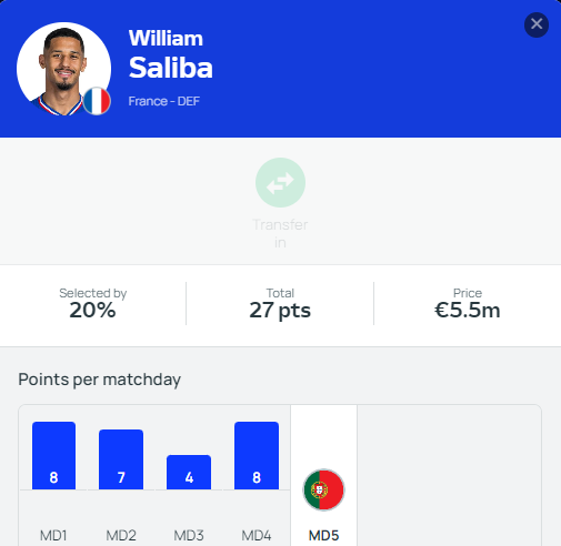 With 3 clean sheets and a total of 23 balls recovered, William Saliba has quietly impressed in Euro Fantasy, amassing 27 points for managers. However, his key defensive prowess will face a significant test against Portugal in the upcoming match.