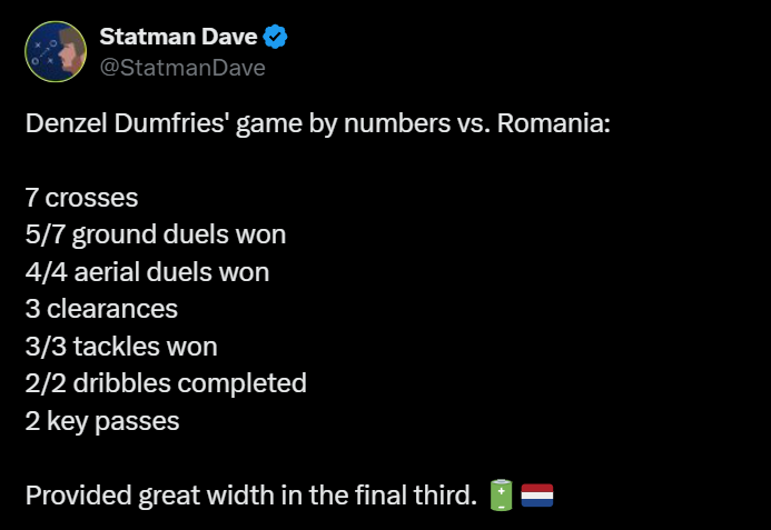Despite initial doubts about his playing time, Denzel Dumfries has started in three of his last four appearances as the Netherlands’ right wing-back. In their recent match against Romania, Dumfries played in a much advanced role and recorded an expected assist (xA) of 0.28, second only to Cody Gakpo’s 0.94 xA.