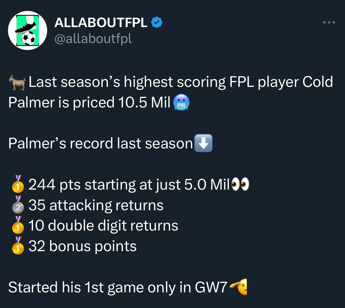 - Cold Palmer, the highest-scoring player last season with 244 pts is in despite costing 10.5 Million this time. Chelsea’s fixtures are great from GW2 onwards and Palmer is still a solid option despite his hefty price tag.