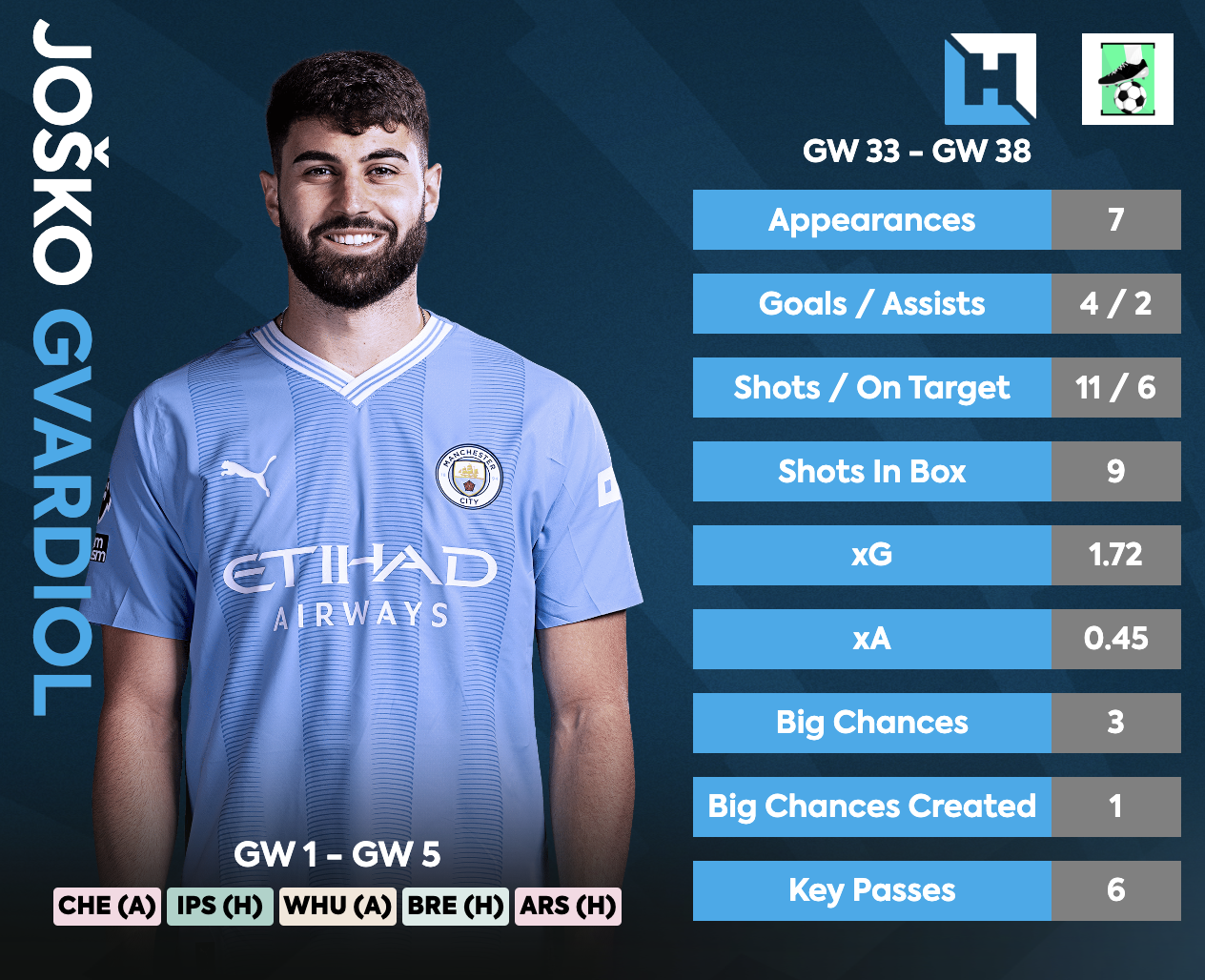 - Gvardiol also offers the potential of CS and attacking returns, between GW33-GW38 of last season Gvardiol picked up four goals and two assists registering 68 points(Joint highest during the period)