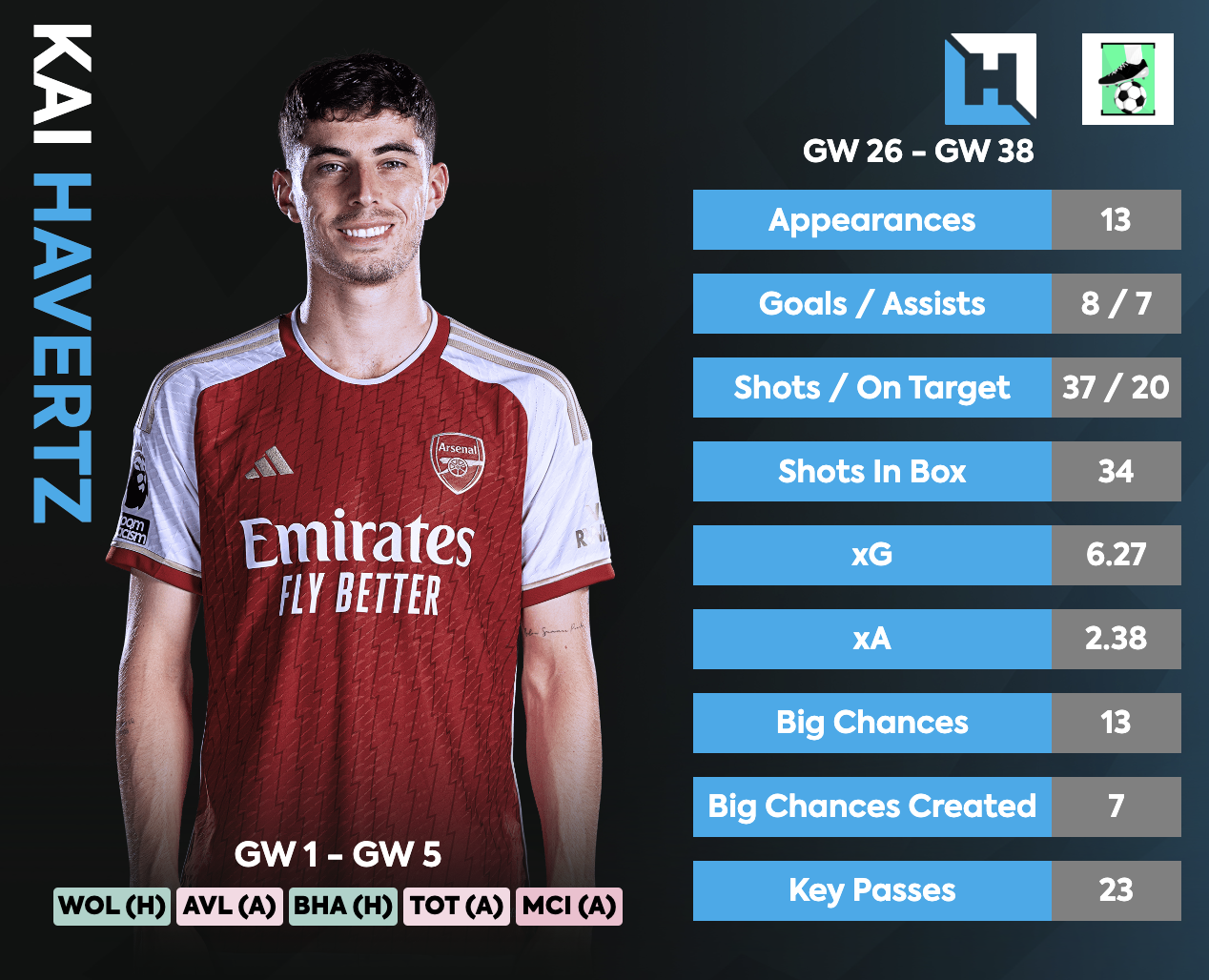 - Kai Havertz’s 1st season at Arsenal ended strongly after Arteta started to play him regularly as the CF(Starting GW26), in the 13 games during the period Havertz scored 8 goals and picked up 7 assists for a total of 105 pts(2nd amongst all players)