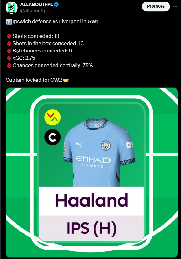 Haaland opened his account with a sharp finish at Stamford Bridge which is a positive sign for owners. He now faces Ipswich at Home where he is the clear captaincy choice of the week.