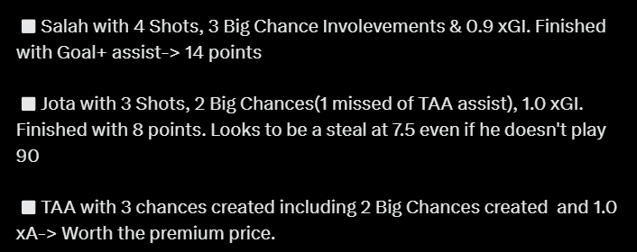 For example, Salah was heavily involved on the weekend as Ipswich playing at home left space in behind for balls to be fired over the top of the defensive line to Salah. Brentford travelling to Anfield this Gameweek are very unlikely to employ the same tactics as they sit back and soak pressure.ย By watching Liverpool play a more conservative team, we will see which of their assets flourish in these matchups. We can then use that information and their upcoming fixture list to choose who to transfer in for the medium-term fixtures. It could be TAA, Salah, Szoboszlai or Jota that benefit from Arne Slot’s tactics in these types of fixtures. Only time will tell.ย