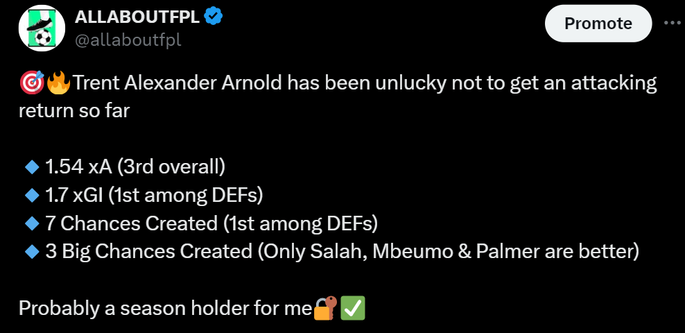 - We have a defensive Liverpool double-up of Trent and Robertson. Liverpool have kept 3 clean sheets from 3 games and the Best xGC(2.19) in the league so far. Trent Alexander Arnold has been very attacking so far and was unlucky not to get an attacking till now as highlighted below.