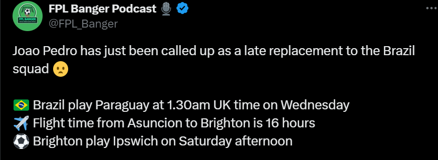 - Joao Pedro(5.7) rounds up this team as the enabler attacker. Pedro has been the pick of the Budget Forwards so far with 2 goals from the last 2 games and has also played 90 minutes in the last 2 games. He is also on penalties which works out well from FPL point of view. Brighton also have 2 good home fixtures up next vs Ipswich(H) and Forest(H).