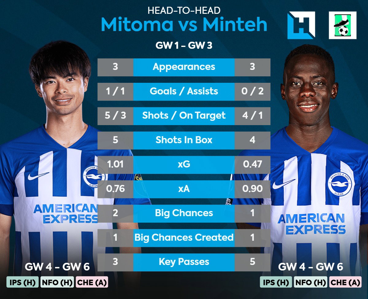 - The 1st of our Brighton Wingers, Minteh has slotted to the Premier League seamlessly. 2 Assists in 3 Games and great performances in the 3 Games with an xG of 0.5 and an xA of 0.9.