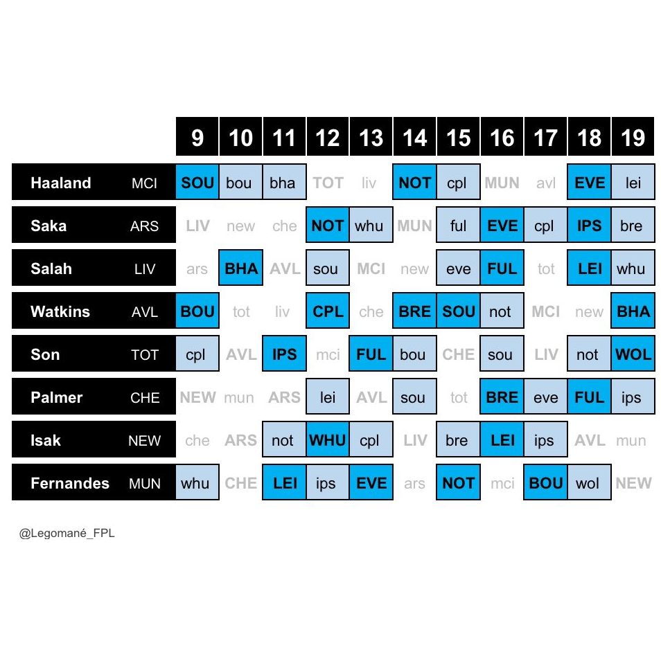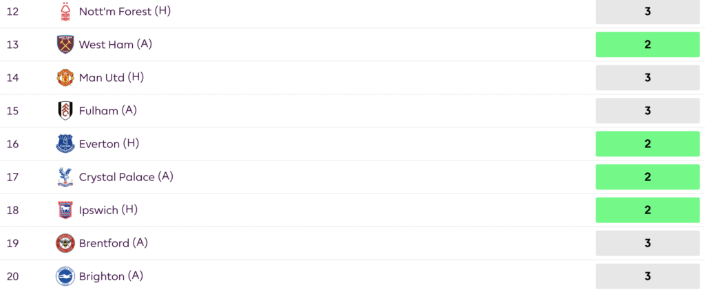 | Ipswich (GW11) | Man City (GW12) | Fulham (GW13) | Bournemouth (GW14) | |
