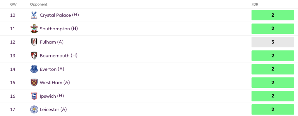 With a late goal in GW9, Cunha rewarded those managers who ended up going early on him. Moving forward, Cunha looks like one of the best cheap forwards to go to, as his fixtures are amazing, with the 6th easiest fixtures for attackers over the next six GWs.