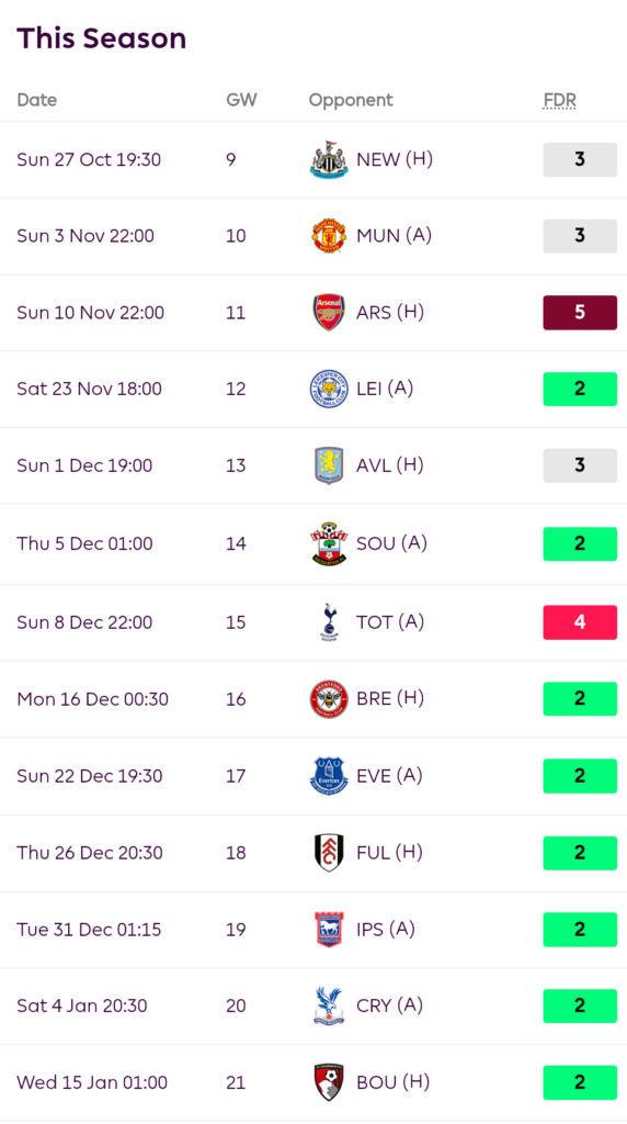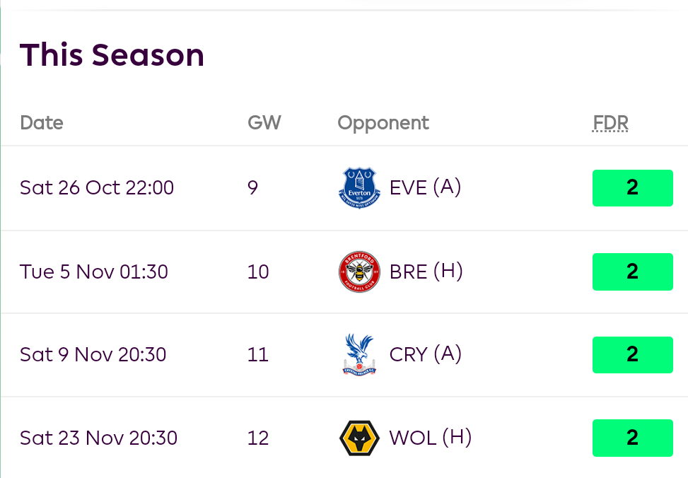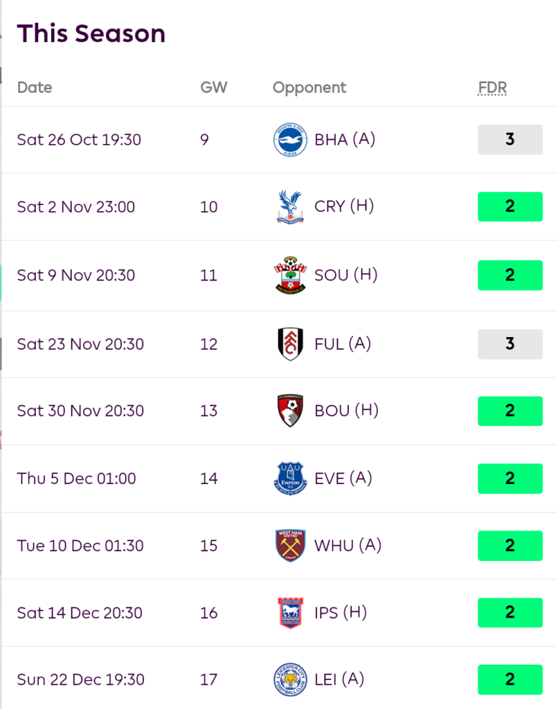 Palmer’s record speaks for itself and even if he has slightly harder fixtures than Son, Palmer is still a player that can perform in any fixtures. An interesting dilemma going into GW9, but with his haul potential and fixtures swing in GW12, where he will become template, Palmer is a player strictly on my watchlist.