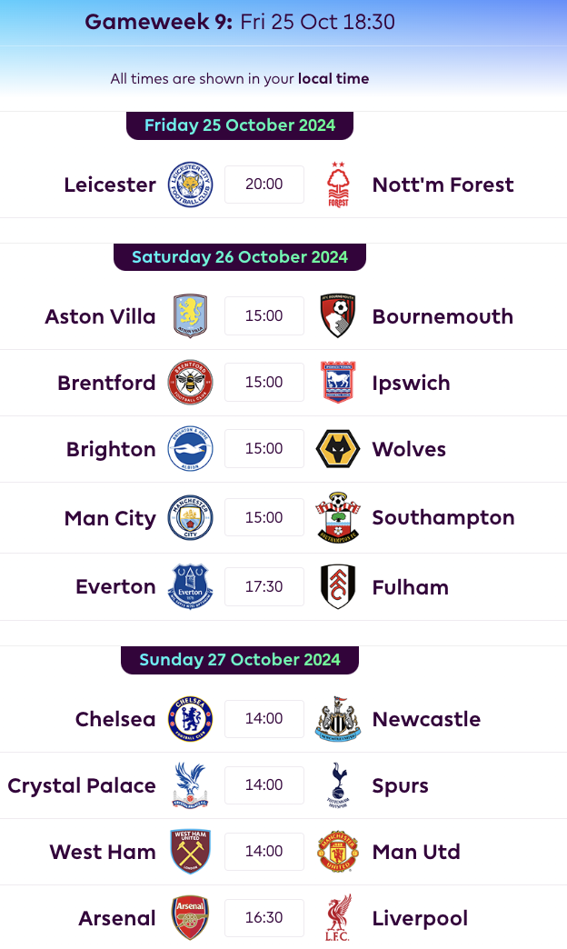 FPL GW9 Fixtures