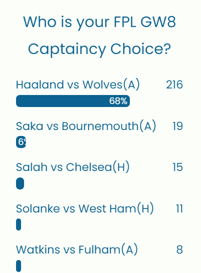This week the top five are very interesting with Haaland still comfortably topping the FPL GW8 captaincy poll in spite of consecutive blanks in GW6 and GW7. Saka and Salah take the 2nd and 3rd place. Solanke is fourth this week in the captaincy poll due to a good fixture vs West Ham at home. Watkins is fifth in the captaincy poll. The top five that will be going into the captaincy metrics this week will be Haaland, Saka, Salah, Solanke and Watkins.