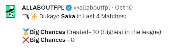 Saka is last for underlying numbers due to a low xG of 1.70. But it is to be noted that his assist threat is the best in the league during this run- 22 Chances created including 11 Big Chances created both comfortably the Highest in the league.