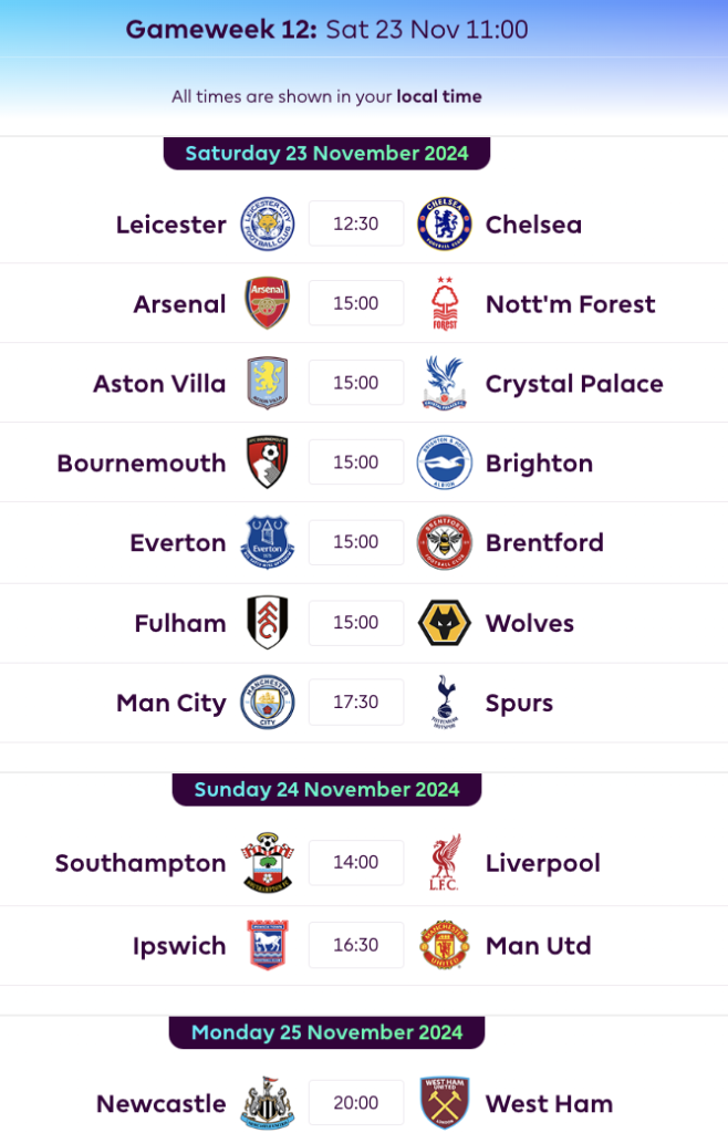 FPL GW12 Fixtures