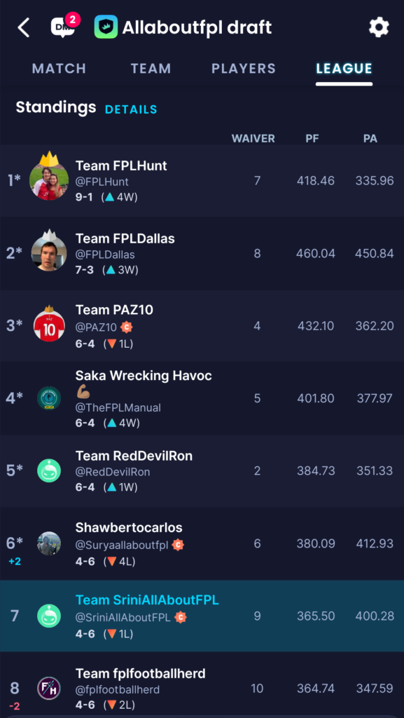 AllAboutFPL Invitational Draft League Standings: