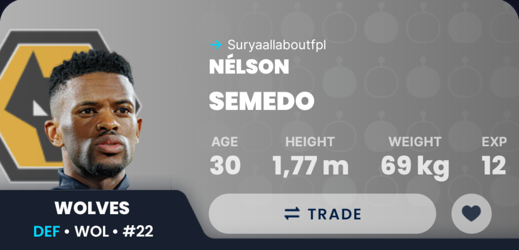 Ait Nouri is obviously the Top Wolves defender choice as he has got an insane attack threat with 3 goals, 2 assists from 10 games. Ait Nouri is unlikely to be available in the Free market, so Semedo is the next best pick.