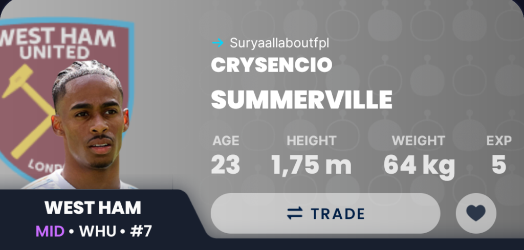 Summerville came on as a substitute vs Manchester United and got the winning goal in GW9. He also created 3 chances from the 45 minutes he played in GW9. He got his start vs Forest in GW10 but had a ordinary game and was taken off at HT. But it’s only a matter of time before Summerville starts performing.