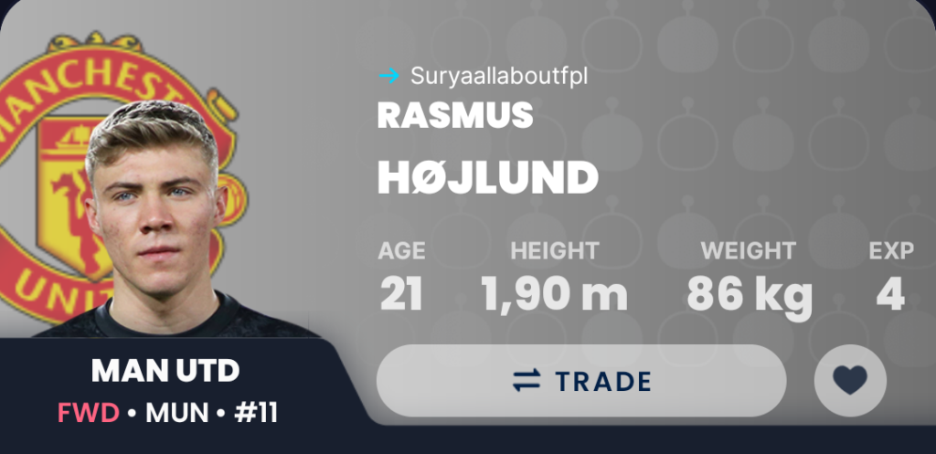 Hojlund has started the last 3 matches and has looked decent as well. He won the penalty for the Bruno Fernandes penalty vs Chelsea and also got a goal vs Brentford in GW8. Ruben Amorin is a very good tactical manager who brings out the best in Strikers and it might well be the time for Hojlund to unleash himself in Premier League to his full potential.