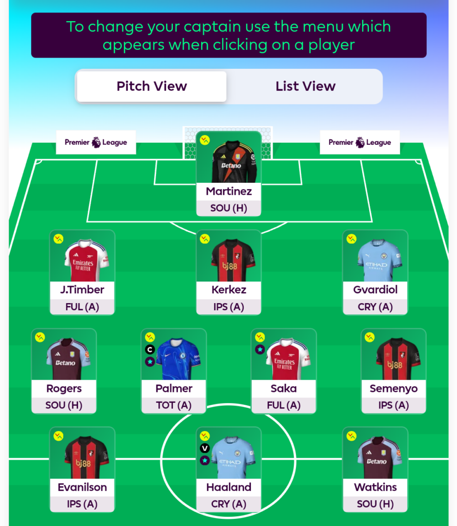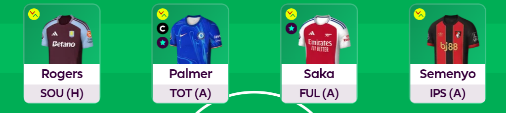 Our midfield quartet is made up of Rogers(5.3m), Palmer (11.0m), Saka (10.5m) and Semenyo (5.7m), and as you can see: we are backing the early kick off!
