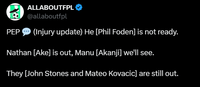 The latest injury updates are that Stones, Ake are ruled out and Akanji still doubtful. This increases Gvardiol’s expected minutes.