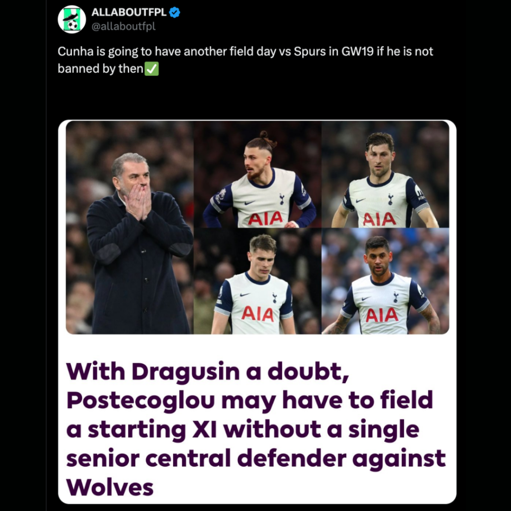 Cunha is last with a 49% anytime return & a 5.5 points projection in GW19 vs Spurs(A).