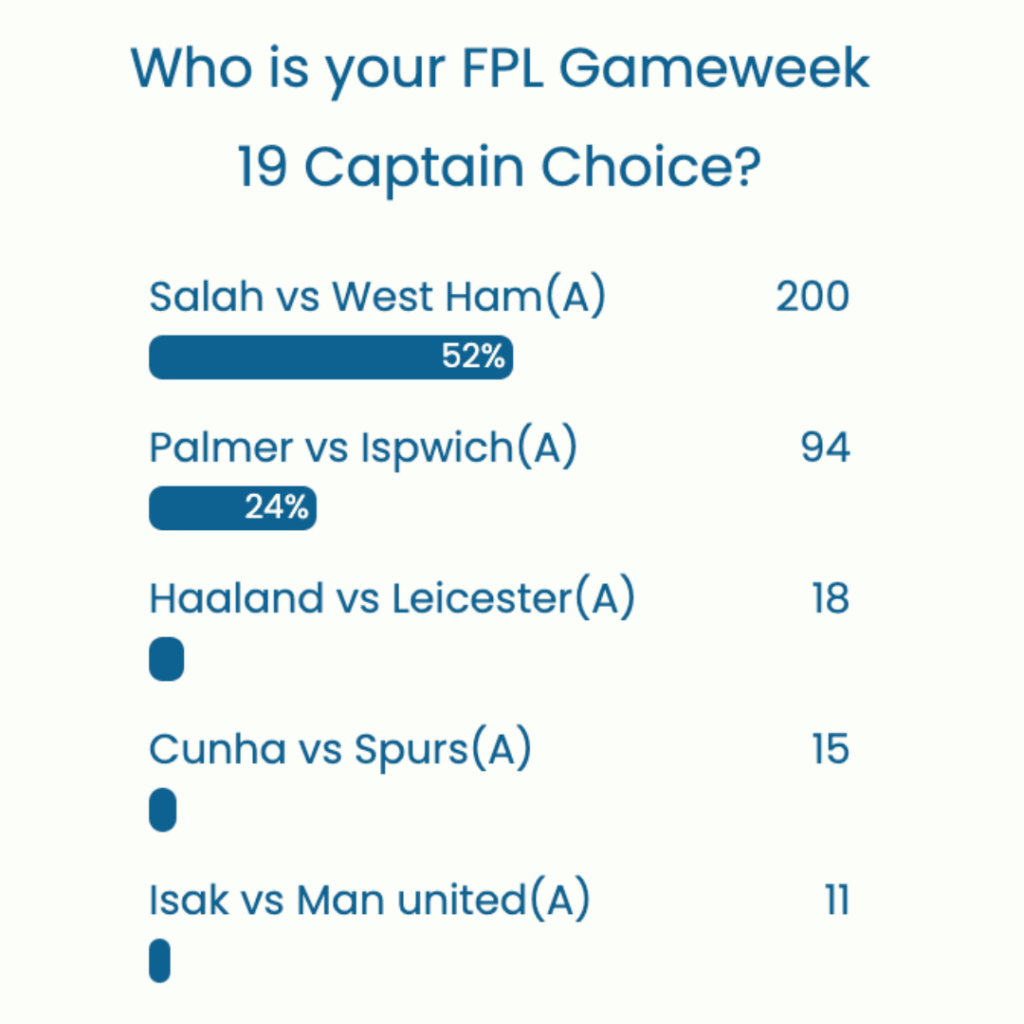 Salah is on top of the captaincy poll for GW19 with a whopping 52% of the votes and will be up against West Ham on Sunday. King Mo has blanked only twice so far this season and has registered 11 double-digit hauls already. Palmer is 2nd in the captaincy poll ahead of a juicy game against Ipswich this week.