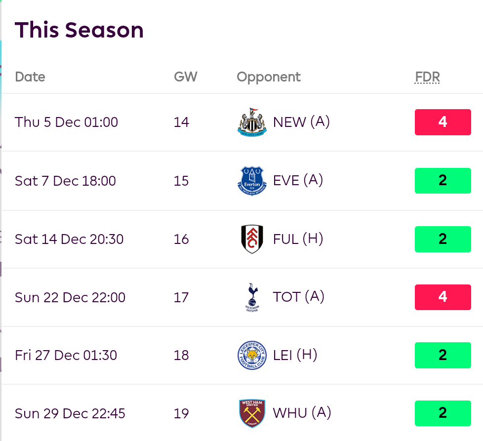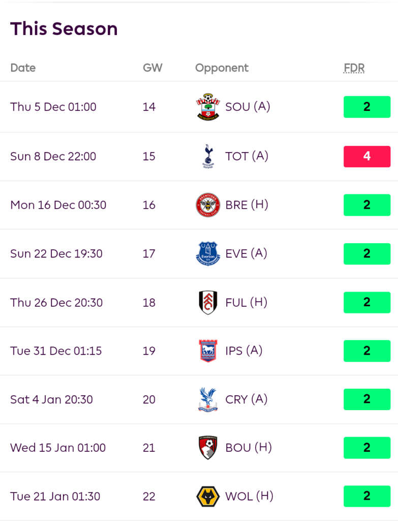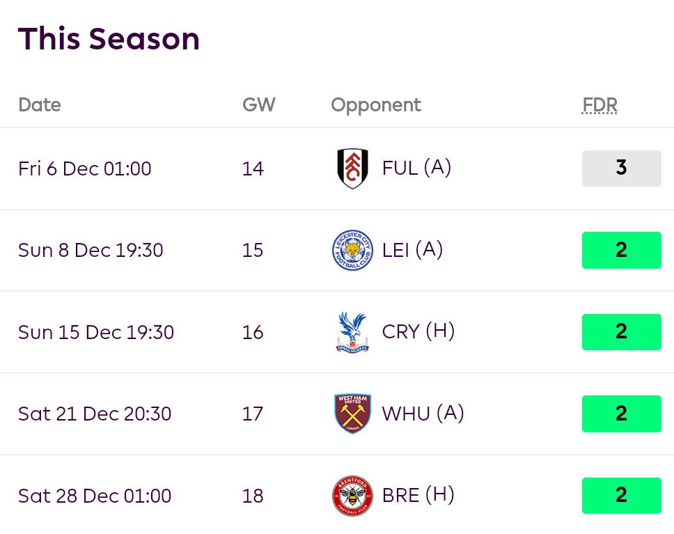An injury to Konate(ruled out at least for 5-6 weeks) brings the Budget Defender from Liverpool into FPL consideration. Liverpool have some great fixtures after the Newcastle game and are keeping clean sheets for fun under Slot’s controlled approach. He may not have the best attacking threat but his budget price tag combined with the great run of fixtures makes him an excellent pick during the Festive period. Gomez should also be fairly nailed on with Slot not the biggest fan of Quansah.