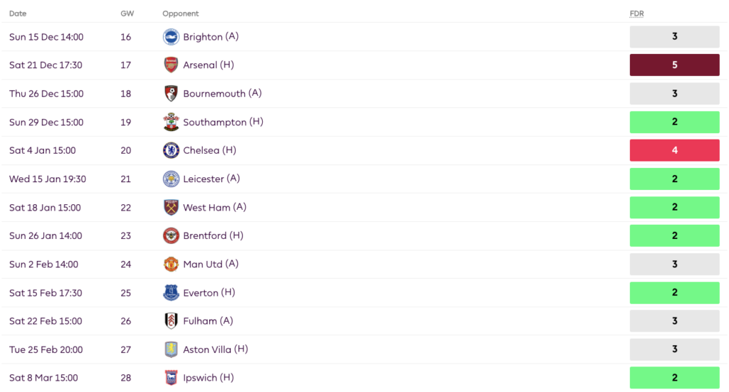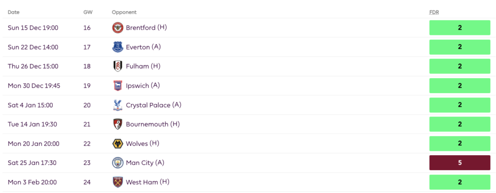 Even though the entry point does not look great for Munoz in terms of clean sheet vs Brighton, he is still capable of getting attacking returns. If you can bench him in GW17 vs Arsenal, the fixtures after that are just brilliant.