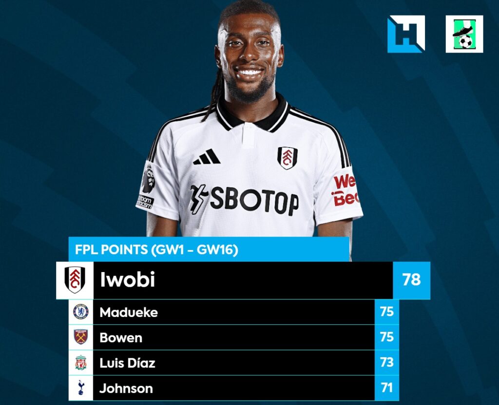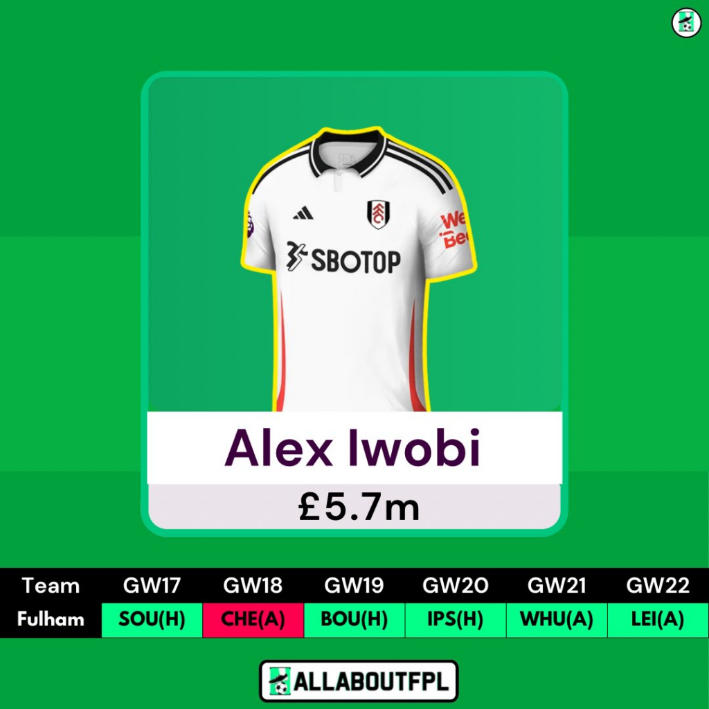 Alex Iwobi in your FPL team is something you wouldn’t have imagined a few years back. To put things into context, Iwobi got 5 goals, and 2 assists last season and he has already surpassed it this season with 5 goals, and 3 assists from 16 games. He has more FPL Points this season than the likes of Son, Bowen, and Diaz. Iwobi’s recent form is more impressive as he has 3 goals, 2 assists, and 36 points from the last 6 games despite playing Arsenal, Liverpool, and Tottenham. With Andreas suspended for GW17, Smith Rowe is expected to play as the No.10 and Iwobi taking up LW which works in his favor.