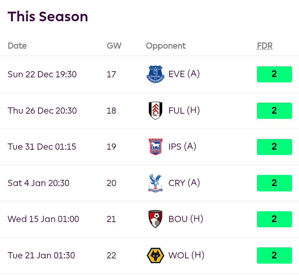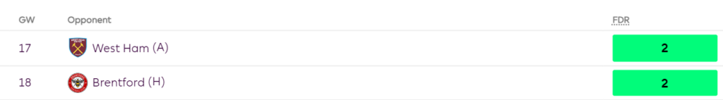 Outside the Chelsea game, all these games are really good fixtures for Fulham considering their current form- They are unbeaten in the last 4 games despite playing Liverpool, Arsenal, Tottenham, and Brighton. It wouldn’t be a shock if they averaged 2 goals/game during this run.