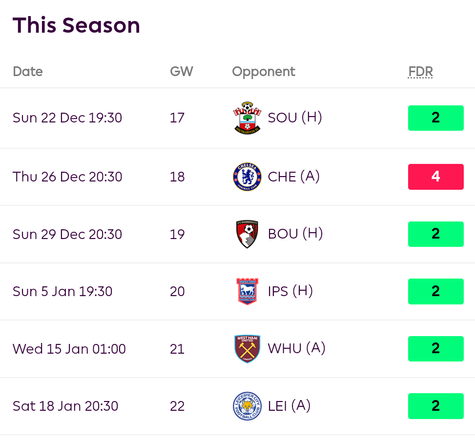First things first, if you are buying in Raul Jimenez for this amazing fixture run, be prepared to only get 70 minutes per game and a benching in one of the next 3-4 Gameweeks during the festive period. Like every other team Fulham play 4 games over the next 2 weeks and there is no secret that Jimenez’s minutes will be managed. But despite that, he is an excellent budget option to consider.