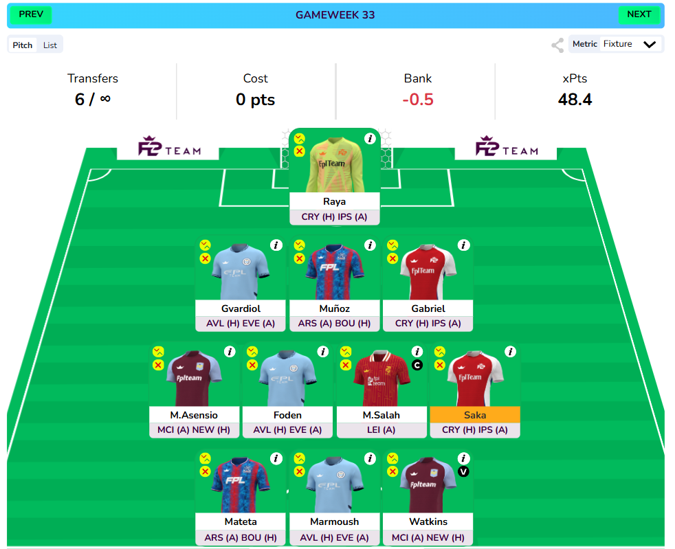- Arteta vs IPS(A), CRY(H) or Pep vs EVE(A), AVL(H) are other options in GW33 if you want to play it safe.