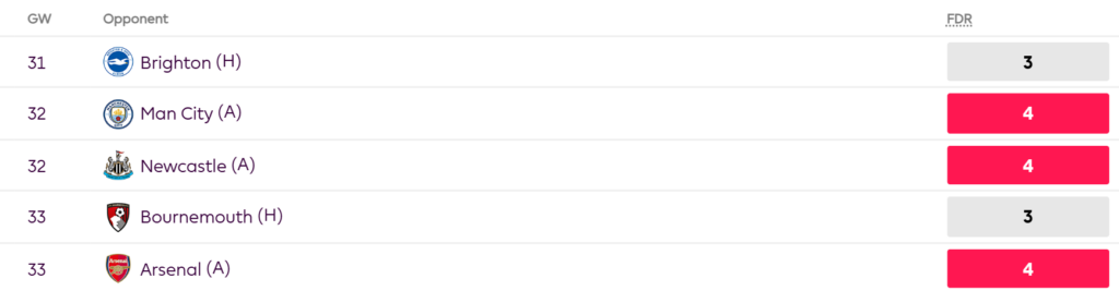 | West Ham | vs Man United(A), Forest(H) | Possible DGW if Forest beat Man City and reach FA Cup finals |