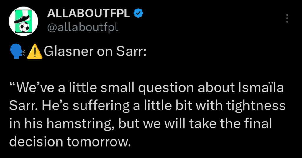 The latest update we have from today’s press conference is that Sarr is an injury doubt.
