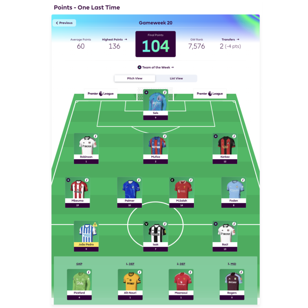 - GW20 – Mbeumo 19 pts & Raul 13 Pts (-4)