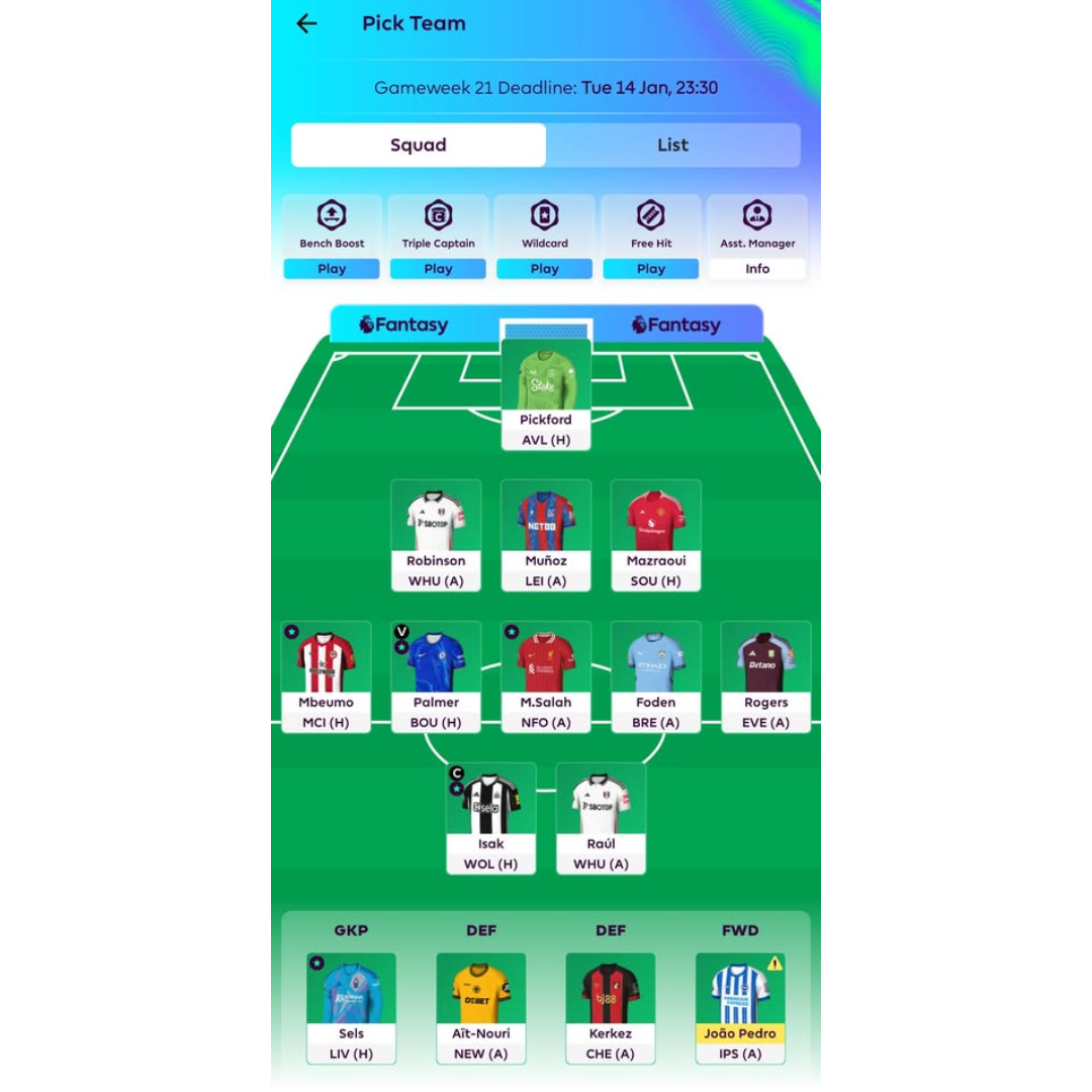That being said, it has also been a bit of a headache at times, choosing between Sels and Pickford, as I’ve occasionally lost points on the bench due to rotation or unforeseen circumstances. However, the overall balance has worked well in terms of fixtures, and I’ve tried to minimize the risk while making sure both goalkeepers complement each other effectively.