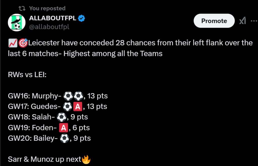 - Leicester have conceded 28 chances from their Left flank over the last 6 matches which is the highest among all teams in the League. Players like Murphy, Guedes, Salah, Foden and Bailey have all got attacking returns playing against Leicester’s left flank. Sarr & Munoz should be the ones to benefit this Gameweek, if things go to plan.