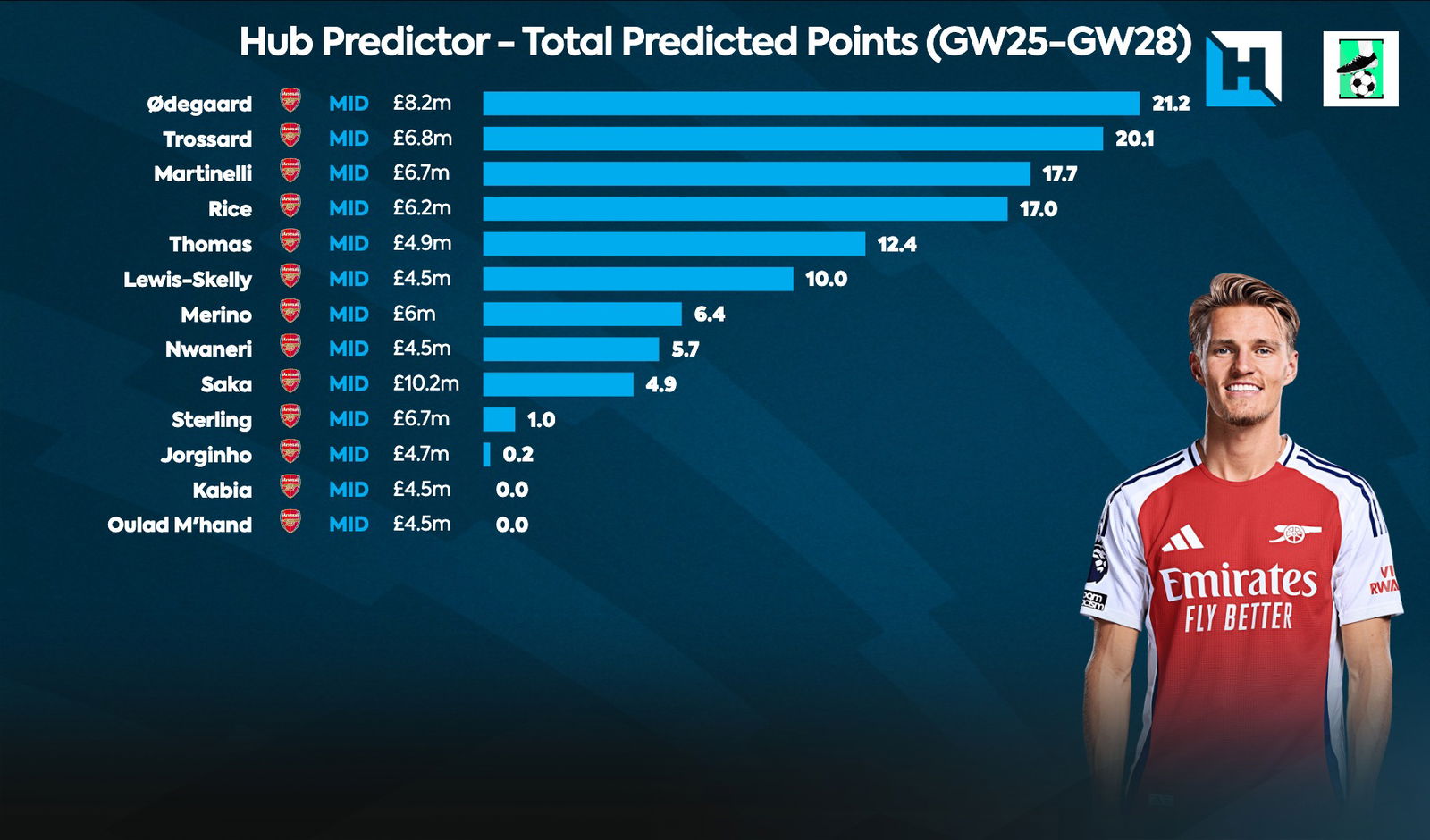 According to our FFHub estimates, Trossard is projected to score an estimate of 20.1 points within Gameweek 25-28. These projections suggest a possible U-turn in form for Leandro Trossard as Arsenal take on Leicester and West Ham in their next two games.