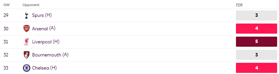 Aside from the players who are unavailable for GW29, the two most sold assets this week are Cole Palmer and Omar Marmoush. While there’s a solid case for managers moving Palmer on—given his recent dip in form and a tough run of fixtures ahead—the decision to sell Marmoush appears a bit reactionary. His benching against Forest (his first this season) came after 5 consecutive starts. Fixture-wise, Marmoush remains well-positioned, and his underlying stats suggest there’s potential for points if he’s back in the starting XI.