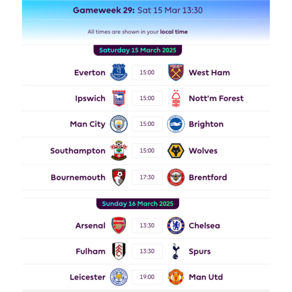 FPL GW29 Fixtures