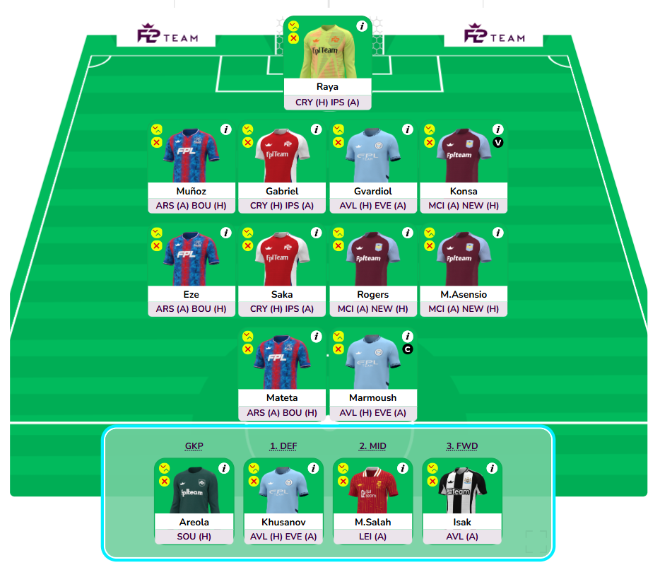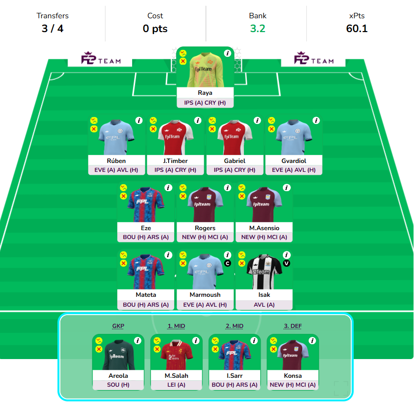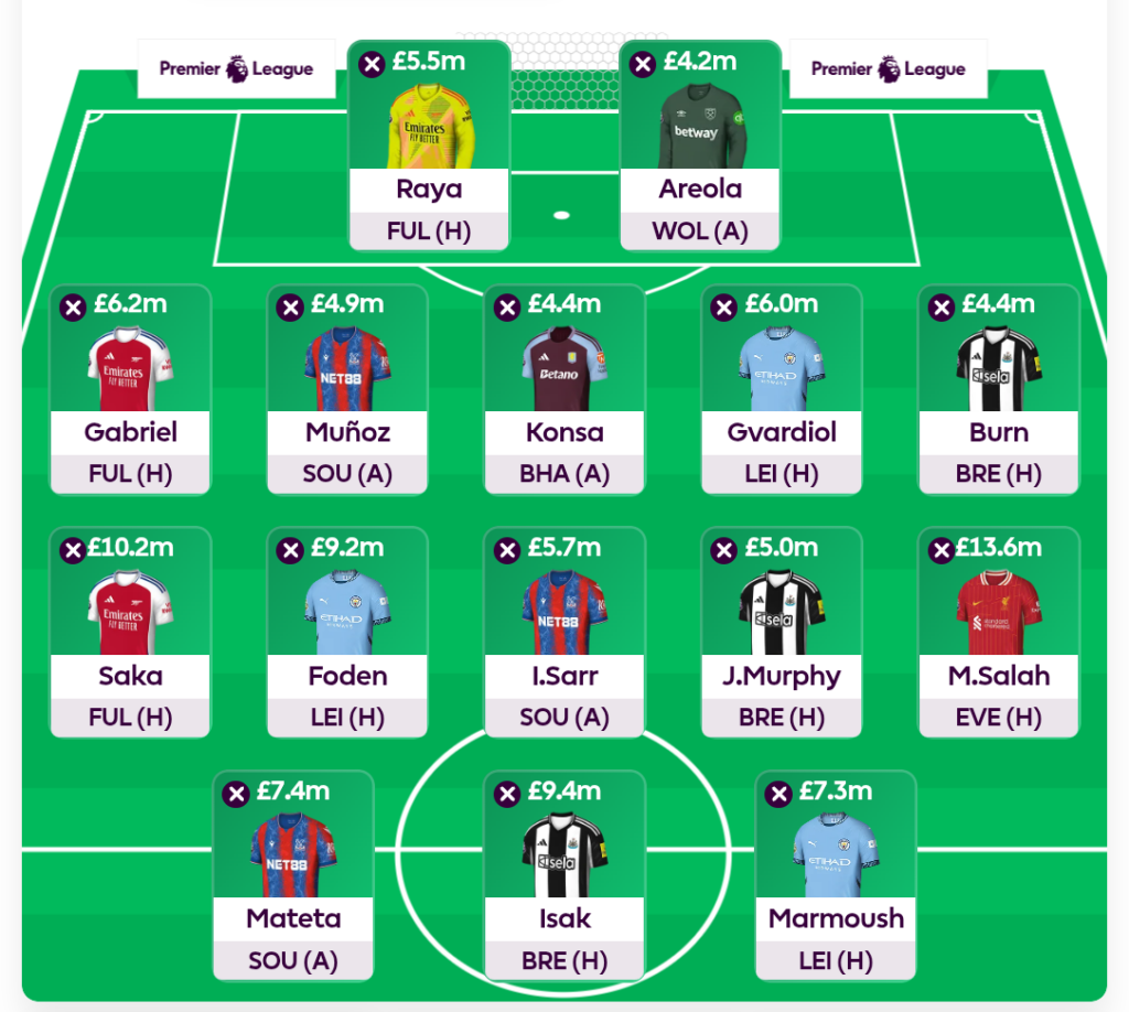 - Saka vs Foden is a 50-50 call you want to take based on Saka’s fitness and minutes prediction. Foden is also a good alternative as Haaland’s injury pushes Marmoush’s minutes which in turn improves Foden’s minutes behind the striker. If you are going for Foden over Saka, you can triple up on Arsenal defense as well.