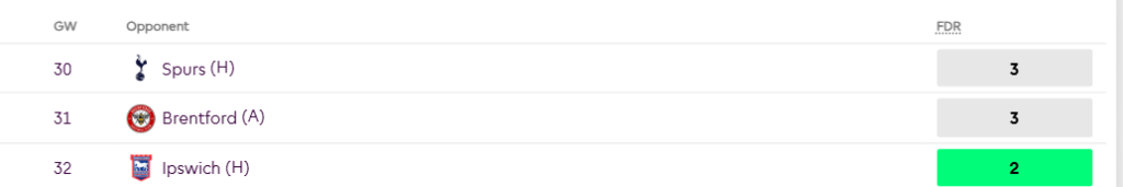 - Good fixtures in GW30-GW32 for Palmer and Chelsea. You can hold till GW32 for the Ipswich game and then move out for DGW assets like Saka/Haaland if needed.