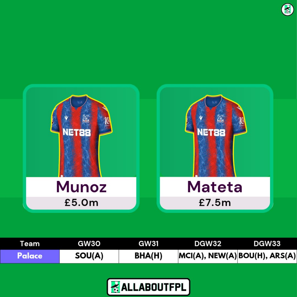 - Triple Palace Attack- Eze, Sarr, Mateta in this Draft for Munoz as the DGW32 and DGW33 are good for attackers over Defenders.