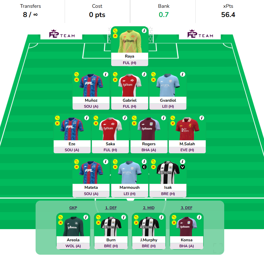 Midfielders: Salah, Palmer, Saka(if fully fit), Kluivert, Eze, Sarr, Murphy, Merino, Rogers, Asensio, Rashford, Elanga, Minteh