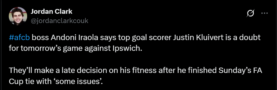 - Kluivert is a doubt for the Ispwich game. So we have removed him from this draft(He was there earlier).