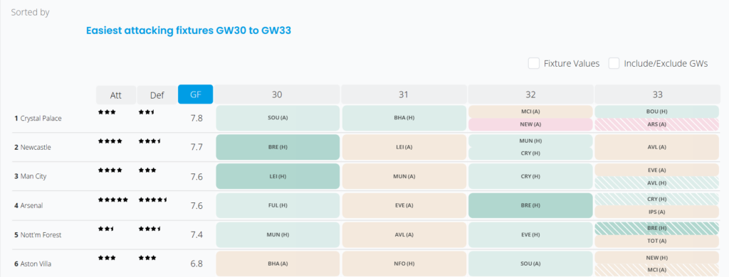 The Eagles are placed top in terms of advantageous schedules between Gameweeks 30 and 33, which means Ismaila Sarr and his colleagues will play at least six games before a blank Gameweek 34.