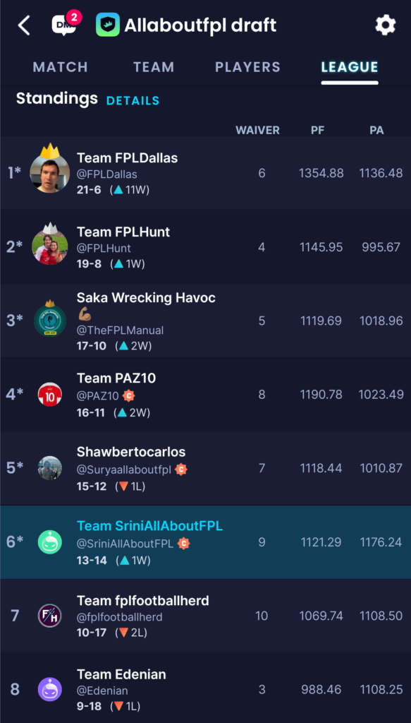AllAboutFPL Invitational Draft League Standings: