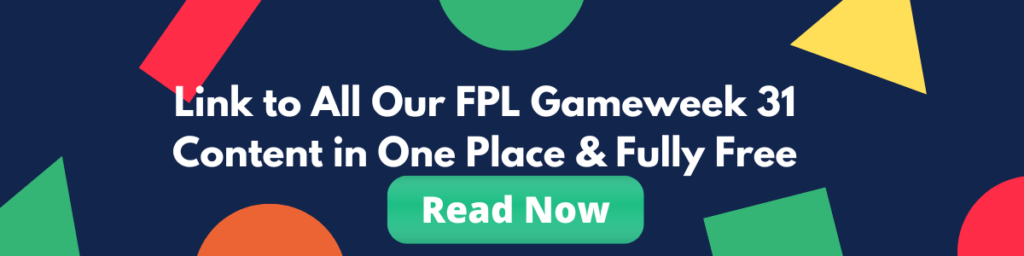Link to all our FPL GW31 blogs including scout picks, players to target, buy, hold, sell analysis, differentials, captaincy metrics, transfer targets, and more. Completely free to access as well!