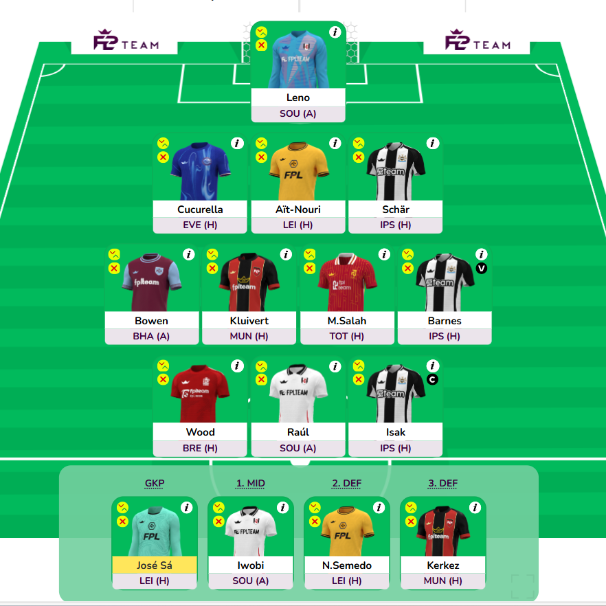 - Midfielders: Salah, Diaz, Palmer, Barnes, Murphy, Iwobi, Gibbs White, Mbeumo, Kluivert, Bruno Fernandes, Bowen, Mitoma