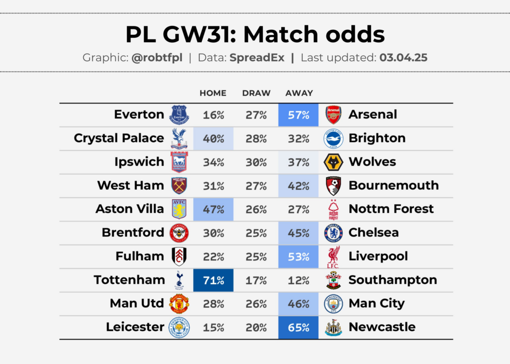 These are our predictions our GW31 Predictions. Do check out the Matchday 31 Odds from RobTFPL which should give you an idea of how the matches are likely to go ahead before locking in your predictions.